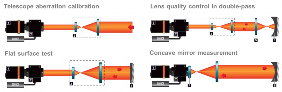 Phasics的SID4软件可以直接测量PtV, RMS, WFE和曲率半径等,可直接进行自我校准,两次测量相位作差等。非常方便应用于平面球面等形貌测量。部分测量光路如右图所示